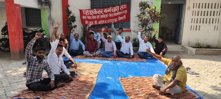 Bihar News-बीएमडी महाविद्यालय दयालपुर के परिसर में शिक्षकेत्तर कर्मचारी संघ द्वारा अपनी विभिन्न मांगो के समर्थन में धरना प्रदर्शन किया । काला बैज लगाकर कार्य का बहिष्कार किया गया। शिक्षकेत्तर…