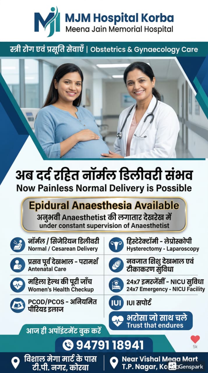 NOW HINDUSTAN. कोरबा शहर के लब्धख्याति एमजेएम हॉस्पिटल (मीणा जैन मेमोरियल हॉस्पिटल) में महिला स्वास्थ्य एवं प्रसूति सेवाओं के अंतर्गत “पेनलेस नॉर्मल डिलीवरी” की सुविधा सफलतापूर्वक दी जा रही है।…