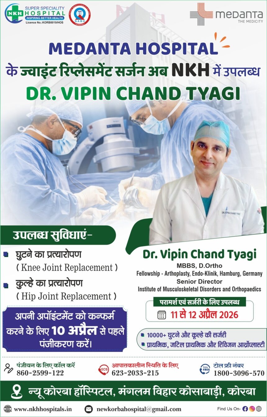न्यू कोरबा हॉस्पीटल (एनकेएच) में विश्वस्तरीय जॉइंट रिप्लेसमेंट सुविधा उपलब्ध , मेदांता के विशेषज्ञ डॉ. विपिन चंद त्यागी दो दिन रहेंगे उपलब्ध…….