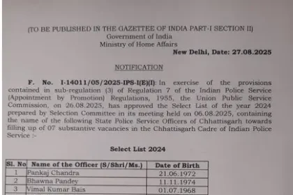 रायपुर:-छत्तीसगढ़ के सात पुलिस अधिकारियों को भारतीय पुलिस सेवा (IPS) कैडर में…