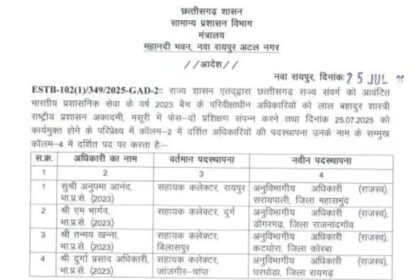 ब्रेकिंग न्यूज़ :-4 आईएएस अधिकारियों को मिली पदस्थापना , तन्मय खन्ना बने कटघोरा एसडीएम……..