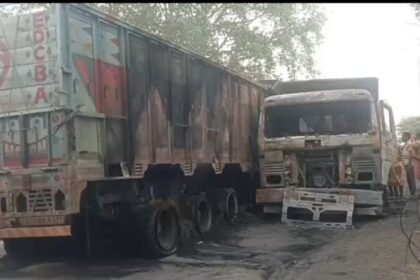 2 ट्रकों में टक्कर के बाद लगी भीषण आग-जिंदा जला एक वाहन चालक……