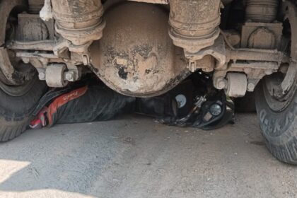 हाइवा ने खड़ी बाइक को रौंदा-बाइक फंसी हाइवा के अंदर……