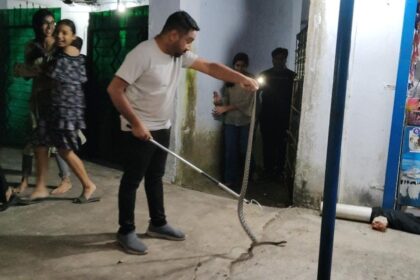 घर में राशन सामग्री के बीच बैठा दिखा अनोखा काले सफेद रंग का सर्प…….