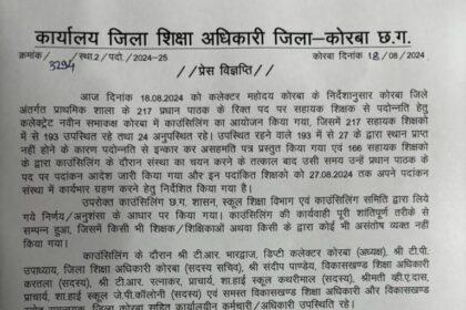 NOW HINDUSTAN. कोरबा जिले में प्रधानपाठक प्राथमिक शाला के रिक्त 217 पदों…