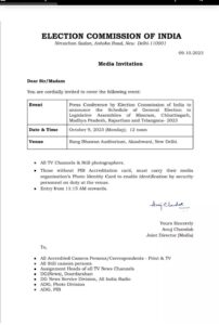 कोरबा NOW HINDUSTAN 2023 में होने वाले देश के पांच राज्यों के विधानसभा चुनाव की तैयारी पूरी हो चुकी है कभी भी आचार संहिता लग सकता है मिली जानकारी के अनुसार चुनाव आयोग सोमवार की दोपहर 12:00 बजे प्रेसवार्ता कर चुनाव की घोषणा कर सकता है जिसमें छत्तीसगढ़ ,मध्य प्रदेश, राजस्थान, मिजोरम और तेलंगाना में चुनाव होने हैं।