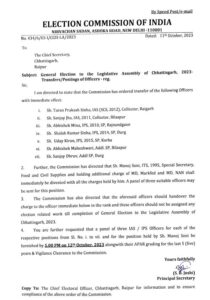 कोरबा रायपुर NOW HINDUSTAN. 11 अक्टूबर 2023 आचार संहिता लगने के बाद चुनाव आयोग ने बड़ी कार्रवाई की है। कलेक्टर-एसपी को हटाने का आदेश आयोग ने दिया है। जिन अधिकारियों को हटाने का आदेश दिया गया है। उसमें रायगढ़ कलेक्टर तारण प्रकाश सिन्हा, बिलासपुर कलेक्टर संजीव झा, राजनांदगांव एसपी अभिषेक मीणा, दुर्ग एसपी शलक्ष सिन्हा, कोरबा एसपी उदय किरण, बिलासपुर के एडिश्नल एसपी अभिषेक महेश्वरी और दुर्ग के एएसपी संजय ध्रुव शामिल हैं।