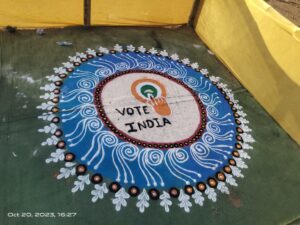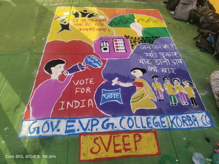NOW HINDUSTAN. कार्यालय कलेक्टर एवं जिला निर्वाचन अधिकारी जिला- कोरबा एवं जिला स्वीप नोडल अधिकारी के निर्देशानुसार एवं महाविद्यालय के प्राचार्य के मार्गदर्शन में आगामी विधानसभा आम निर्वाचन 2023 के मतदाता जागरूकता कार्यक्रम के अंतर्गत आज दिनाँक 20 अक्टूबर 2023 को शासकीय इं. वि. स्नातकोत्तर महाविद्यालय कोरबा के स्वीप इकाई द्वारा स्वीप रंगोली , चित्र कला एवं पोस्टर प्रतियोगिता का आयोजन कोरबा नगर के फेस -1 सुभाष चौक एवं शास.उ. मा. विद्यालय पीडब्ल्यूडी रामपुर में किया गया। अनिवार्य एवं निष्पक्ष मतदान करने, मतदान प्रतिशत को बढ़ाने ,चुनाव को पारदर्शी बनाने, मत का महत्व के बारें में महाविद्यालय के विद्यार्थियो के बीच रंगोली, चित्रकला एवं पोस्टर प्रतियोगिता के माध्यम से जागरूकता संदेश दिया ।