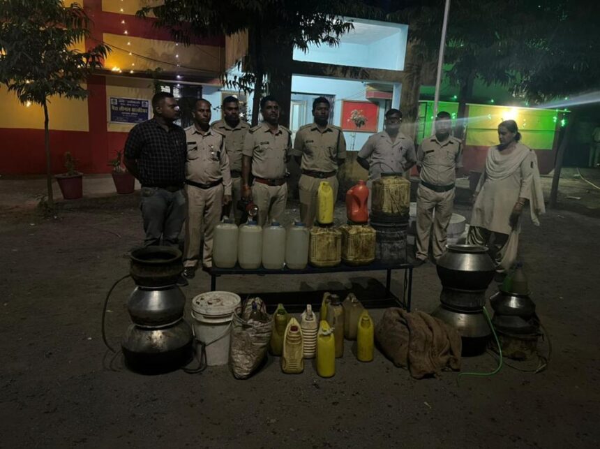NOW HINDUSTAN korba पुलिस अधीक्षक कोरबा जितेंद्र शुक्ला द्वारा आगामी विधानसभा चुनाव 2023 के मद्देनजर अवैध गतिविधियों पर रोकने हेतु दिशा निर्देश एवं मार्गदर्शन दिए गए थे जिस पर अतिरिक्त पुलिस अधीक्षक अभिषेक वर्मा एवं नगर पुलिस अधीक्षक दर्री रॉबिंसन गुड़िया के दिशा निर्देश एवं मार्गदर्शन पर 03 Oct को नगर पुलिस अधीक्षक दर्री के नेतृत्व में थाना हरदीबाजार एवं थाना कुसमुंडा की एक संयुक्त टीम बनाकर ग्राम मुरली में अवैध महुआ शराब पर कार्यवाही किया गया, पुलिस टीम को सूचना मिली थी कि ग्राम मुरली में काफी मात्रा में महुआ शराब बनाकर भंडारण कर बिक्री किया जाता है। जिस पर पुलिस टीम के द्वारा ग्राम मुरली में छापामार करवाही किया गया जिसमें योगेश नायक पिता शत्रुहन लाल नायक, उम्र 22 साल , जान सिंह नायक पिता दर्जुन लाल नायक, उम्र 35 साल,. बान सिंह नायक पिता दर्जुन लाल नायक, उम्र 33 साल, श्रीमति पुष्पा बाई नायक पति संत कुमार नायक, उम्र 32 साल, सभी निवासी ग्राम मुरली नायकपारा, थाना हरदीबाजार में अवैध महुआ शराब बनाकर भंडारण करके रखे हुए थे इनके कब्जे से करीबन 500 लीटर कच्ची शराब किमती- 50,000 रूपये का जप्त कर आबकारी अधिनियम की धारा 34(2) आबकारी एक्ट के तहत कार्यवाही किया गया है।