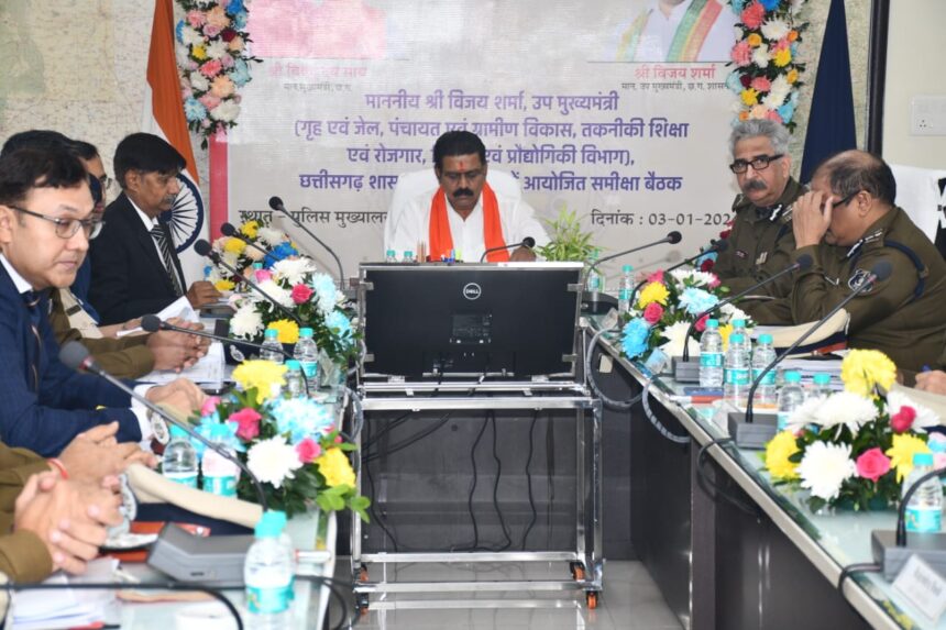 NOW HINDUSTAN छत्तीसगढ़ के शासन के उप मुख्यमंत्री व गृह मंत्री विजय शर्मा ने पदभार ग्रहण करने के बाद पुलिस अधिकारियों की बैठक ली। बल बुद्धि के देव महावीर हनुमान जी के पूजन के साथ हुई पुलिस विभाग की पहली बैठक शुरू हुई । जहां पुलिस बल के मनोबल को बढ़ाने के लिए उनके आवास व आधारभूत संरचना की शीघ्र कार्य योजना प्रस्तुत करने के निर्देश दिए।
