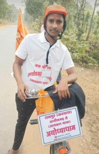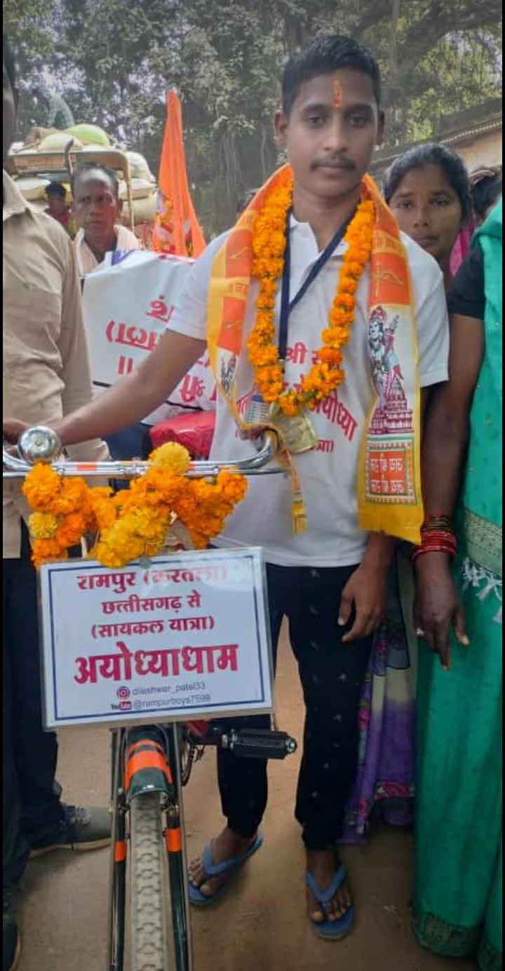 यहां करतला विकासखण्ड अंतर्गत आने वाले ग्राम पंचायत व विधानसभा रामपुर के 20 वर्षीय दिलेश्वर पटेल अपनी जन्मभूमि रामपुर से साइकिल पर रामनाम की अलख जगाते हुए आज सुबह 09 बजे से निकल चुके हैं। वे करीब 12 दिन का सफर तय कर श्री राम जन्मभूमि अयोध्या पहुंचेंगे और 22 जनवरी को राम मंदिर की प्राण प्रतिष्ठा में शामिल होंगे।