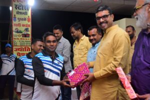 स्व केशव लाल मेहता स्मृति क्रिकेट प्रतियोगिता के मुख्य अतिथि विकास रंजन महतो को कोरबा प्रेस क्लब के अध्यक्ष राकेश श्रीवास्तव, सचिव दिनेश राज, कोषाध्य्क्ष रंजन प्रसाद, कार्यकारिणी सदस्य हरीश तिवारी, वरिष्ठ पत्रकार नरेंद्र मेहता, राजेंद्र मेहता, ई.जयंत समेत ने पुष्प गुच्छ भेंट करके उनका स्वागत किया। कार्यक्रम के अंत में स्मृति चिन्ह भेंट कर उनका सम्मान करते हुए आभार व्यक्त किया गया। इस दौरान अपने उद्बोधन में विकास रंजन महतो ने आयोजन को सुंदर और गरिमामयी बताते हुए सराहना की। उन्होंने आगे कहा कि इस तरह शासकीय विभागों और औद्योगिक उपक्रमों की टीमों के बीच हंसी-खुशी आयोजन करवाने की परंपरा बेहद ही अनूठी है। वरिष्ठ पत्रकार की याद में इस प्रतियोगिता के लिए कोरबा प्रेस क्लब बधाई की पात्र है।