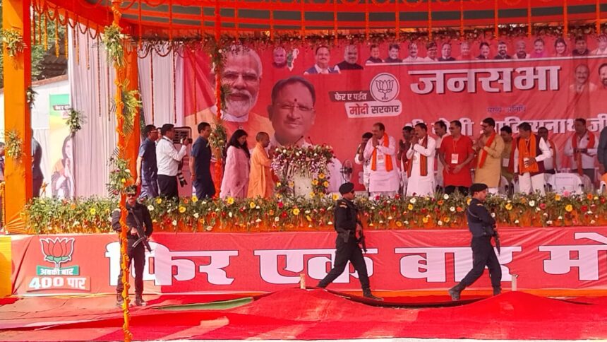 NOW HINDUSTAN कोरबा सीएसईबी के फुटबॉल ग्राउंड में आयोजित जनसभा को सम्बोधित करने उत्तर प्रदेश के मुख्यमंत्री योगी आदित्यनाथ नाथ कोरबा पहुचे ।