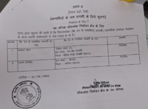 NOW HINDUSTAN korba लोकसभा चुनाव 2024 के तीसरे चरण में कोरबा लोकसभा में वोट डाले जाएंगे। जिसके नामांकन का कार्य नाम वापसी और चुनाव चिन्ह वितरण के साथ के साथ सोमवार को पूर्ण हो गया। कोरबा लोकसभा चुनाव के लिए 34 लोगों ने आवेदन पत्र जमा किया गया था । जिसमें स्कूटनी के बाद पांच लोगों के नामांकन पत्रों को गलत पाए जाने पर उन्हें रद्द कर दिया गया । इसके बाद 29 प्रत्याशी ही मैदान में बच्चे थे । 22 अप्रैल को नाम वापसी का दिन था जिसमें दो लोगों ने अपना नामांकन वापस ले लिया । जिसमें राजन पांडे और कमल खान के नाम सामने आए हैं । अब मैदान में पत्र 27 उम्मीदवार बच्चे हैं। जिनके मध्य मुकाबला होगा ।