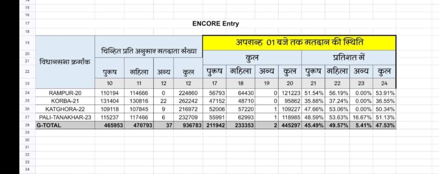 NOW HINDUSTAN korba लोकसभा चुनाव के तीसरे चरण के मतदान में लोगों का उत्साह देखने को मिल रहा है । दोपहर 1:00 बजे तक कोरबा लोकसभा के जो आंकड़े सामने आए है । उसमें रामपुर ,कोरबा, कटघोरा और पालीतानखार में 47% मतदान हुआ है उम्मीद की जा रही है कि शाम 5:00 बजे तक 70% से अधिक मतदान होने की संभावना है।