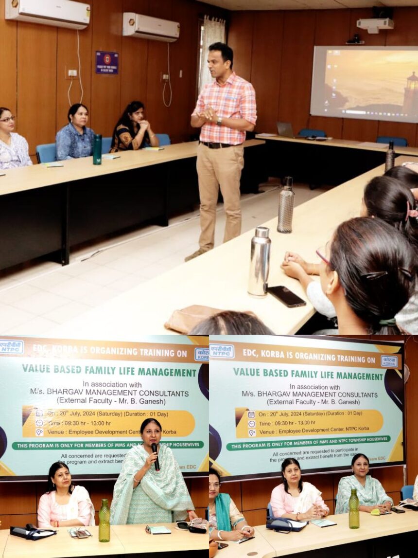 NOW HINDUSTAN कोरबा, 20 जुलाई 2024- एनटीपीसी कोरबा ने आज अपने कर्मचारी विकास केंद्र (EDC) के माध्यम से “मूल्य-मूलिक परिवार जीवन प्रबंधन” (“Value-Based Family Life Management”) पर विशेष प्रशिक्षण कार्यक्रम सफलतापूर्वक आयोजित किया। इस कार्यक्रम का आयोजन एम/एस. भार्गव मैनेजमेंट कंसल्टेंट्स के साथ किया गया था, जिसमें विदेशी विशेषज्ञ बी. गणेश भी शामिल थे। यह कार्यक्रम 20 जुलाई 2024 को एनटीपीसी कोरबा में हुआ।