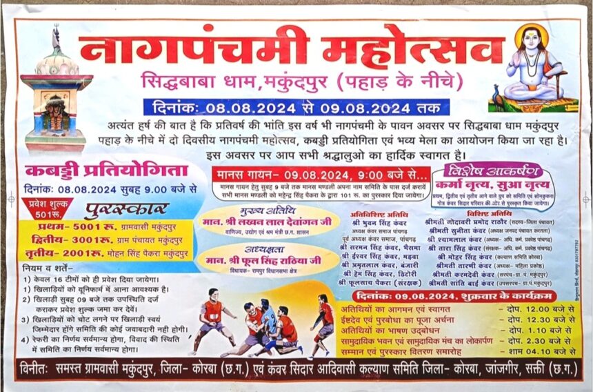 NOW HINDUSTAN. कोरबा जिले के करतला ब्लाक अंतर्गत सिद्धबाबा धाम मकुंदपुर में कंवर सिदार आदिवासी कल्याण समिति द्वारा नागपंचमी महोत्सव 8 व 9 अगस्त को आयोजित होने जा रहा है। दो दिवसीय महोत्सव में कबड्डी प्रतियोगिता व भव्य मेला होगा।