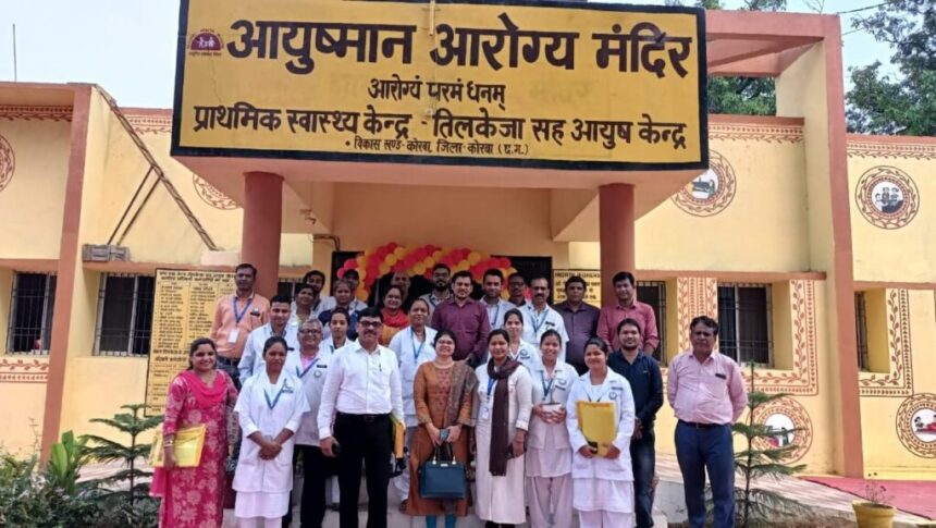 NOW HINDUSTAN korba. आयुष्मान आरोग्य मंदिर प्राथमिक स्वास्थ्य केंद्र तिलकेजा को कोरबा जिले में स्वच्छता एवं गुणवत्तापुर्ण स्वास्थ्य लाभ सेवाए देने पुरूस्कार प्राप्त है। कोरबा जिले के कोरबा विकासखंड के आयुष्मान आरोग्य मंदिर प्राथमिक स्वास्थ्य केंद्र तिलकेजा को बेहतर और गुणवत्तापुर्ण स्वास्थ्य सेवा के लिए राष्ट्रीय स्तर पर गुणवत्ता आश्वासन मानक संस्था द्वारा 93.00 प्रतिशत मानक अंक के साथ राष्ट्रीय क्वालिटी सर्टिफिकेशन प्रदान किया गया है। कोरबा विकासखंड में आयुष्मान आरोग्य मंदिर प्राथमिक स्वास्थ्य केंद्र तिलकेजा, यह पुरूस्कार पाने वाला दुसरा प्राथमिक स्वास्थ्य केंद्र बन गया है।