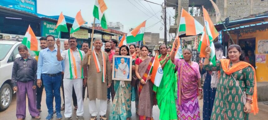 राष्ट्रपिता महात्मा गांधी की तस्वीर और राष्ट्रीय ध्वज के साथ निकाली यात्रा