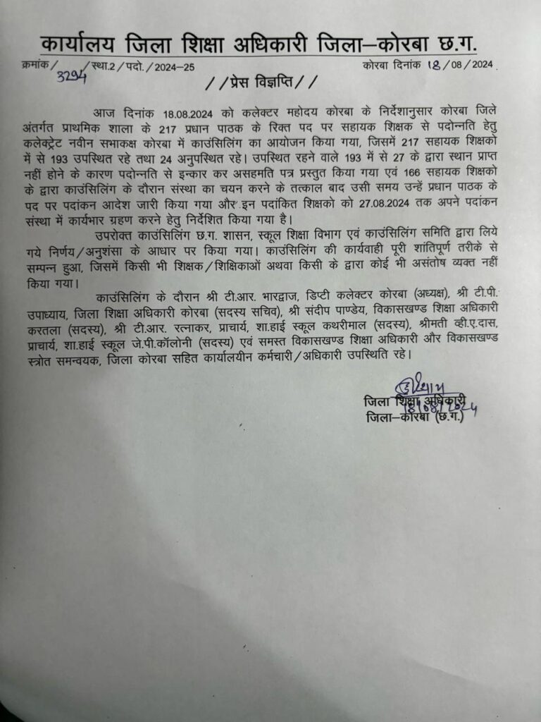 जारी प्रेस विज्ञप्ति के अनुसार काउंसलिंग समिति के अध्यक्ष डिप्टी कलेक्टर टी.आर. भारद्वाज, सदस्य सचिव डीईओ टी.पी. उपाध्याय, बीईओ कोरबा संदीप पांडेय सहित अन्य सदस्यों की मौजूदगी में संपन्न हुआ। काउंसलिंग में यह दावा किया गया है कि शिक्षक-शिक्षिकाओं ने किसी भी तरह का असंतोष व्यक्त नहीं किया गया।