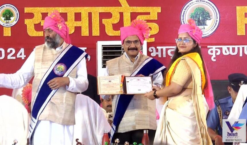 NOW HINDUSTAN. Korba. अटल बिहारी वाजपेयी विश्वविद्यालय, बिलासपुर द्वारा आयोजित पाँचवें दीक्षांत समारोह में गरिमामयी वातावरण के बीच विभिन्न विषयों में पीएचडी, डिग्री, और उच्च शिक्षा में उत्कृष्ट प्रदर्शन करने वाले मेधावी छात्र-छात्राओं को गोल्ड मेडल एवं प्रमाण पत्र देकर सम्मानित किया गया। इस ऐतिहासिक अवसर पर, प्रवीण्य सूची में स्थान प्राप्त करने वाली कु. आस्था अग्ये को पोस्ट ग्रेजुएशन डिप्लोमा इन मैनेजमेंट में छत्तीसगढ़ राज्य में प्रथम स्थान प्राप्त करने पर स्वर्ण पदक से अलंकृत किया गया।
