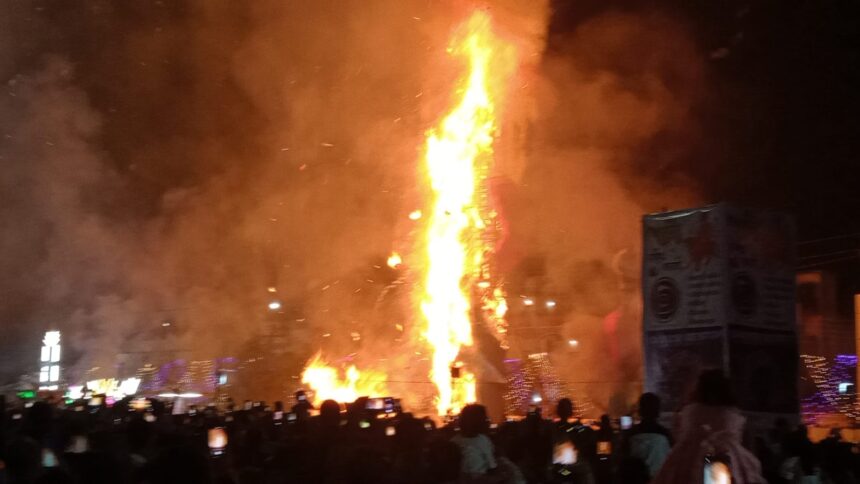 जय श्री राम के जयघोष के साथ दशहरा मैदान में लाखों भीड़ के बीच रावण, कुम्भकर्ण , मेघनाथ के पुतले का दहन किया गया । बुराई का प्रतीक रावण और उसका भाई कुम्भकर्ण , पुत्र मेघनाथ का पुतला धु धु कर जल उठा ।