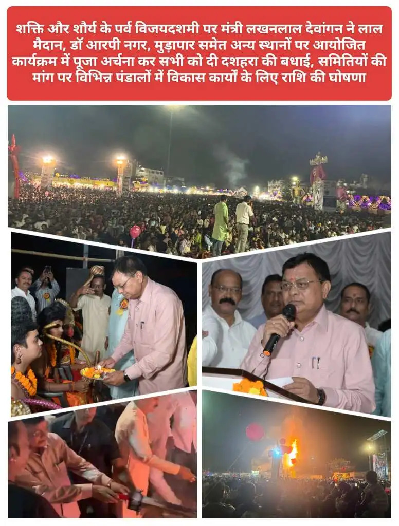 इसके बाद कैबिनेट मंत्री श्री देवांगन पुरानी बस्ती स्थित रानी रोड पर आयोजित दशहरा उत्सव में शामिल हुए। इसी कड़ी में कैबिनेट मंत्री श्री देवांगन मुड़ापार बाजार में आयोजित विशाल दशहरा उत्सव में सम्मिलित हुए। मंत्री श्री देवांगन ने कहा की मुड़ापार का दशहरा उत्सव विगत 50 वर्षों से मनाया जा रहा है। कैबिनेट मंत्री श्री देवांगन ने पंडाल निर्माण की सहर्ष घोषणा की। इसके बाद मंत्री श्री देवांगन भीड़ के बीच पहुंचकर सभी को बधाई और शुभकामनाएं दी। फिर रिमोट का बटन दबाकर रावण दहन किया।