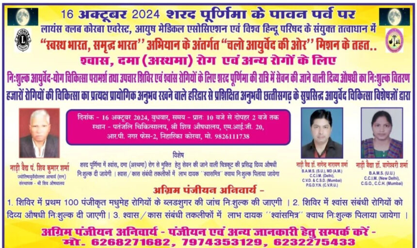 NOW HINDUSTAN. कोरबा जिले में शरद पूर्णिमा पर सेवनीय चित्रकूट की प्रसिद्ध दिव्य औषधि का निशुल्क वितरण एवं श्वास रोगों के लिये विशेष आयुर्वेद-योग चिकित्सा परामर्श एवं उपचार शिविर 16 अक्टूबर को श्री शिव औषधालय एमआईजी 20 आर.पी. नगर फेस 2 शिवाजी नगर रोड निहारिका कोरबा छत्तीसगढ़ मे किया जाएगा। जिसमे अंचल के सुप्रसिद्ध अनुभवी आयुर्वेद चिकित्सा विशेषज्ञ नाड़ीवैद्य पंडित शिव कुमार शर्मा, नाड़ीवैद्या डॉ. वागेश्वरी शर्मा एवं नाड़ीवैद्य डॉ. नागेंद्र नारायण शर्मा देंगे अपनी चिकित्सकीय सेवाएं निःशुल्क देंगे।