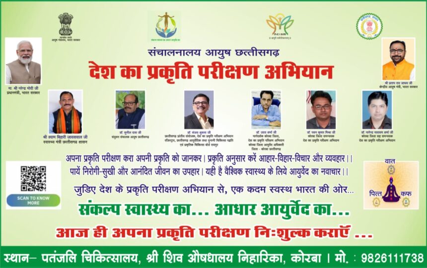 आयुष मंत्रालय भारत के “देश का प्रकृति परिक्षण” अभियान के अंतर्गत” दिनाँक 15 दिसंबर 2024 रविवार से दिनाँक 25 दिसंबर 2024 बुधवार तक दस दिवसीय निशुल्क प्रकृति परीक्षण, रक्त शर्करा जांच, रक्तचाप जांच एवं प्रकृतिनुसार आहार-विहार-विचार परामर्श एवं उपचार शिविर का आयोजन “देश का प्रकृति परिक्षण” अभियान के प्रांतीय संयोजक छत्तीसगढ़ आयुर्वेद यूनानी प्राकृतिक चिकित्सा बोर्ड के रजिस्ट्रार डॉ.संजय शुक्ला जी के निर्देशन में कोरबा जिला आयुर्वेद अधिकारी कोरबा के मार्गदर्शन में “देश का प्रकृति परिक्षण” अभियान कोरबा जिला के समन्वयक डॉ.पवन कुमार मिश्रा एवं सह समन्वयक डॉ.नागेंद्र नारायण शर्मा के नेतृत्व में श्री शिव औषधालय निहारीका में प्रतिदिन प्रात: 10 बजे से आयोजित कीया गया है। “देश का प्रकृति परिक्षण” अभियान के विषय मे अभियान के सह समन्वयक डॉ.नागेंद्र नारायण शर्मा ने बताया की आयुर्वेद के प्रचार-प्रसार को सर्वव्यापी एवं सर्वस्पर्शी करने हेतु भारत के आयुष मंत्री प्रतापराव जाधव जी द्वारा आयुर्वेद क्षेत्र मे शोध के साथ ही आयुर्वेद के बारे में जन जागृति करने हेतु “देश का प्रकृति परिक्षण” अभियान पूरे देश में चलाया जा रहा है। उसी तारतम्य में दिनाँक 15 दिसंबर 2024 रविवार से दिनाँक 25 दिसंबर 2024 बुधवार तक दस दिवसीय निशुल्क प्रकृति परीक्षण, रक्त शर्करा जांच, रक्तचाप जांच एवं प्रकृतिनुसार आहार-विहार-विचार परामर्श एवं उपचार शिविर का आयोजन श्री शिव औषधालय निहारीका में प्रतिदिन प्रात: 10 बजे से आयोजित कीया जा रहा है। जिसमें व्यक्ती अपनी प्रकृति (वात-पित्त-कफ) को जानकर उसके अनुरूप अपनी प्रकृति अनुसार आहार-विहार-विचार, दिनचर्या एवं ऋतुचर्या का पालन कर निरोगी एवं आनंदित जीवन जी सकता है,।