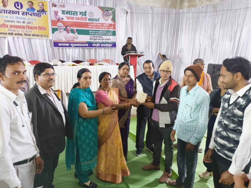 उक्त कार्यक्रम में मुख्य अतिथि पोड़ी एसडीएम तुलाराम भारद्वाज, जनपद अध्यक्ष संतोषी पेंद्रों, जनपद उपाध्यक्ष रामप्यारी, प्रकाश जाखड, जनपद सदस्य किरण मरकाम, जनपद सदस्य गणेश्वरपूरी भोला गोस्वामी, जनपद सीईओ, जय प्रकाश डडसेना एवं सुश्री प्रीति खैरवार की उपस्थिति में दीप प्रज्वलित कर कार्यक्रम को आगे बढ़ाया गया। कार्यक्रम के दौरान विभाग से संचालित योजनाओं की जानकारी दिए मौके पर प्राप्त आवेदन पत्र का निराकारण किया गया साथ ही कृषि विभाग द्वारा 10 किसानो को मुख्यमंत्री की पाती प्रमाण पत्र, विद्यालयीन छात्रों को जाति प्रमाण पत्र, राजस्व विभाग द्वारा किसानों ऋण पुस्तिका, बिहान समूहों दीदी को लोन सहायता राशि व हितग्राही को राशन कार्ड प्रदाय किया गया।