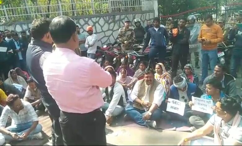 NOW HINDUSTAN. कोरबा-पश्चिम क्षेत्र एसईसीएल गेवरा के मुख्य महाप्रबंधक कार्यालय में विस्थापित ग्राम भिलाई बाजार, उमेंदीभाठा, मुड़ियानार, सलोरा, पंडरिपानी, नावापारा, रलिया, केसला, बरभाटा के बेरोजगार युवकों द्वारा ठेका श्रमिक रोजगार प्रबंधन को कई बार पत्राचार किया जा चुका है। आरोप हैं की प्रबंधन द्वारा किसी को रोजगार प्रदान नहीं किया गया वहीं बाहरी लोगो को रोजगार दिया जा रहा है। प्रबंधन पर इसी वादाखिलाफ़ी का आरोप लगा तालाबंदी की हैं। सैकड़ो ग्रामीण जिला पंचायत के पूर्व उपाध्यक्ष अजय जायसवाल के नेतृत्व में सुबह 9 बजे से महाप्रबंधक कार्यालय गेवरा के दोनों गेट में तालाबंदी कर प्रदर्शन पर बैठ गए हैं।