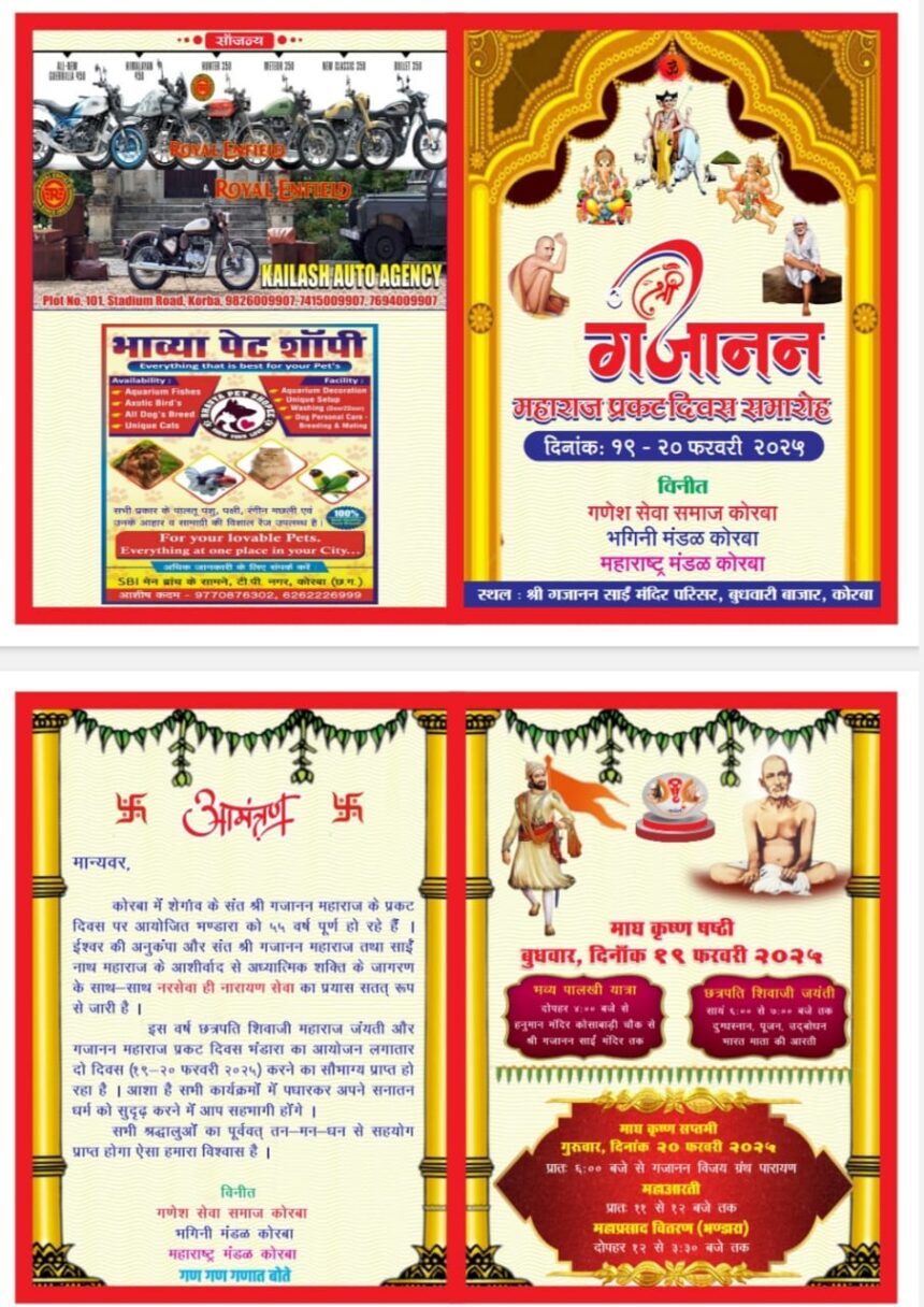गुरुवार दिनांक 20 फरवरी को गजानन महाराज प्रकट दिवस के अवसर पर प्रातः 6:00 से 11:00 तक गजानन विजय ग्रंथ के 21 अध्यायों का पारायण होगा । महाआरती पश्चात दोपहर 3:30 बजे तक भंडारा का आयोजन किया जाएगा । हजारों श्रद्धालु प्रतिवर्षानुसार झुणाका – भाकर का विशेष प्रसाद भी ग्रहण करेंगे । महाराष्ट्रीयन समाज की तीनों समितियां गणेश सेवा समाज कोरबा , महाराष्ट्र भगिनी मंडल कोरबा और महाराष्ट्र मंडल कोरबा के समस्त पदाधिकारीगण की ओर से कोरबा के श्रद्धालुओं को इस अवसर पर आमंत्रित किया जा रहा है ।