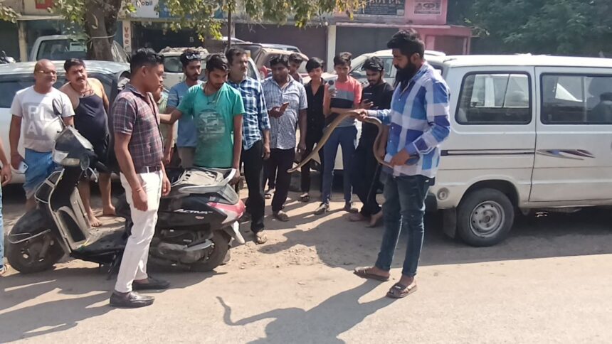 NOW HINDUSTAN. Korba. वीआईपी रोड स्थित इंदिरा चौक के पास किराने की दुकान के सामने खड़े एक्टिवा वाहन में सुबह की वक्त एक जहरीला सांप घुस गया। जैसे ही गाड़ी में सांप घुसने की जानकारी लोगों को लगी बड़ी संख्या में लोग वहां जमा हो गए। वहीं कुछ लोग सांप को निकालने का प्रयास शुरू कर दिया ।इसी बीच सांप पकड़ने वालों को सूचना देकर बुलाया गया और उन्होंने एक्टिवा के डिक्की को खोलकर अंदर से सांप को बाहर निकला । सांप के बाहर निकालने के बाद सब रेस्क्यू करने वालों ने बताया कि यह धमना साप है और चूहा की शिकार को लेकर वह घरों के आसपास निवास करता है। देखिये वीडियो :-