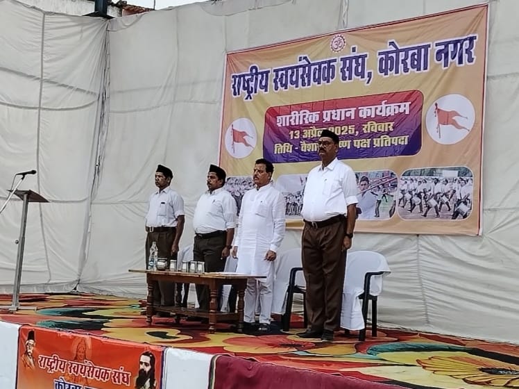 NOW HINDUSTAN. राष्ट्रीय स्वयंसेवक संघ कोरबा नगर का शारीरिक प्रधान कार्यक्रम रविवार को संपन्न हुआ। शारीरिक कार्यक्रम केवल विद्या नहीं है अपितु वीरवृत्ति जगाने वाले, हिम्मत और ताकत बढ़ाने वाले, सामूहिकता और अनुशासन उत्पन्न करने वाले याने संगठित समाज में जो-जो गुण चाहिए वे उत्पन्न करने वाले हैं। ज्ञान-विज्ञान के प्रसार हेतु भी शारीरिक स्वस्थता का आवश्यक होता है।