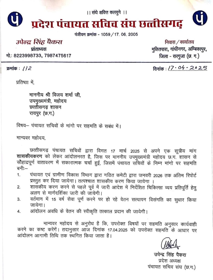 पंचायत एवं ग्रामीण विकास विभाग द्वारा गठित कमेटी जनवरी 2026 तक अंतिम रिपोर्ट सौंपेगी। इसके बाद पंचायत सचिवों का शासकीयकरण किया जाएगा। शासकीयकरण से पूर्व चिकित्सा व्यय प्रतिपूर्ति के लिए अलग से मार्गदर्शिका जारी की जाएगी। वर्तमान में 15 वर्षों की सेवा पूर्ण करने पर वेतन सत्यापन में उत्पन्न विसंगति को दूर किया जाएगा। हड़ताल अवधि के वेतन की स्वीकृति तत्काल प्रदान की जाएगी।