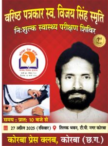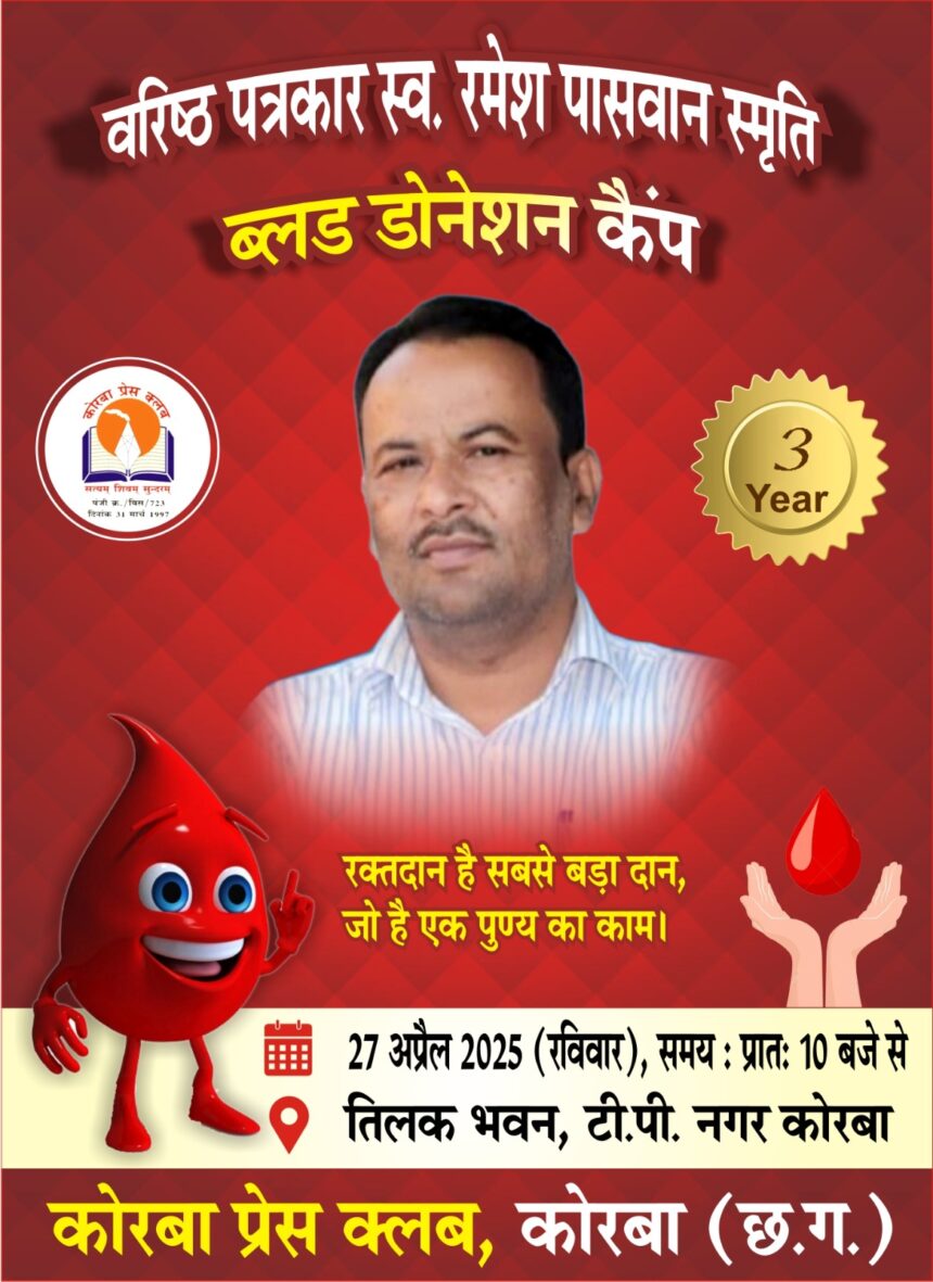NOW HINDUSTAN. Korba. कोरबा प्रेस क्लब के दिवंगत सदस्य वरिष्ठ पत्रकार स्व. स्वर्गीय रमेश पासवान की स्मृति में प्रतिवर्ष की तरह इस वर्ष भी स्वैच्छिक रक्तदान शिविर का आयोजन किया जा रहा है। पिछले वर्ष दिवंगत हुए वरिष्ठ पत्रकार स्व. विजय सिंह की स्मृति में नि:शुल्क स्वास्थ्य परीक्षण शिविर का आयोजन किया जा रहा है। दोनों ही शिविर का आयोजन दिवंगत पत्रकारों के पुण्यतिथि 27 अप्रैल को प्रेस क्लब तिलक भवन में सुबह 10:00 बजे से किए जाने का निर्णय लिया गया है। स्वैच्छिक रक्तदान शिविर में प्राप्त रक्त मेडिकल कॉलेज प्रबंधन को प्रदान किया जाएगा। कॉलेज प्रबंधन के सहयोग से ही उक्त शिविरों का आयोजन किया जा रहा है।