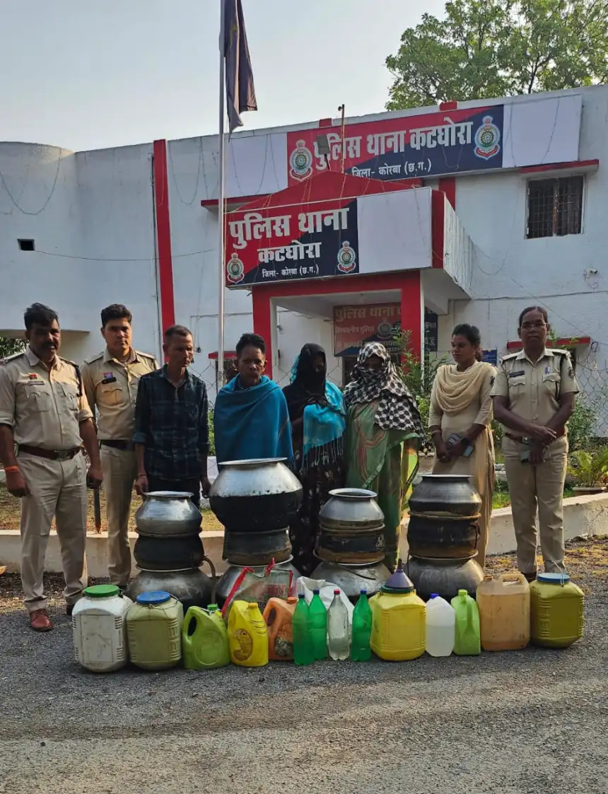 इसी क्रम में कटघोरा थाना क्षेत्र के वार्ड क्रमांक 5, बिंझवार मोहल्ला में चार अलग-अलग स्थानों पर दबिश दी गई। पुलिस टीम को मौके पर भारी मात्रा में अवैध कच्ची महुआ शराब और लाहन बरामद हुई। छापे के दौरान कुल 70 लीटर कच्ची महुआ शराब और 10 क्विंटल महुआ लाहन जब्त किया गया, जिसे बाद में मौके पर ही नष्ट कर दिया गया। इसके साथ ही मदिरा निर्माण में उपयोग होने वाले भट्ठी और बर्तन भी पुलिस द्वारा ज़ब्त किए गए।