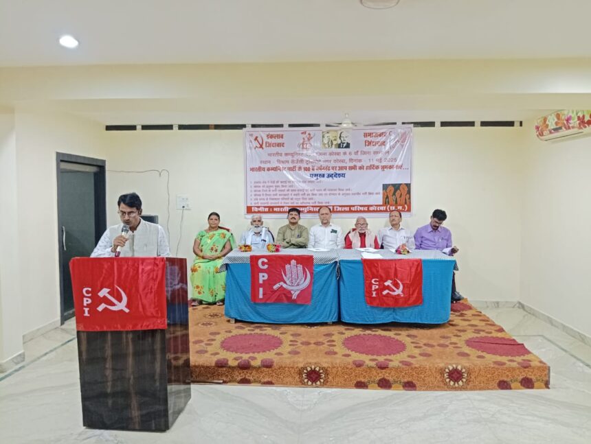 एम एल रजक, धर्मेंद्र तिवारी, अनूप सिंह, एसके सिंह, धरमा राव, मीना यादव, नरेंद्र मिश्रा, अध्यक्ष मंडली में शामिल हुए अध्यक्ष मंडली का पुष्पगुच्छ देकर स्वागत किया गया, सीपीआई जिला कोरबा के जिला सचिव पवन कुमार वर्मा द्वारा प्रतिवेदन प्रस्तुत किया गया, प्रतिवेदन में पार्टी की सौवीं वर्षगांठ सीपीआई का इतिहास, राज्य और केंद्र में भाजपा की सरकार की आदिवासी, मजदूर, किसान,नौजवान विरोधी नीतियों, नफरत और ध्रुवीकरण की राजनीति से शांति और सद्भाव को होने वाले खतरों के बारे में विस्तार से प्रकाश डाला गया
