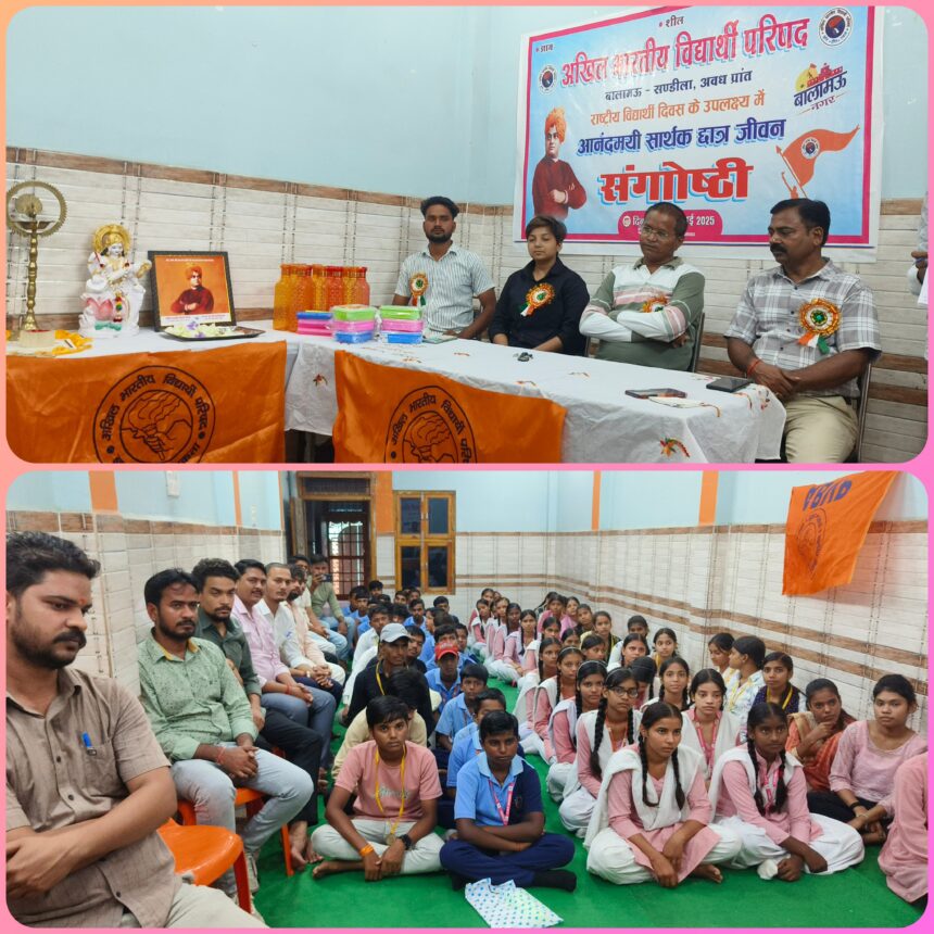 अखिल भारतीय विद्यार्थी परिषद के 77वें स्थापना दिवस राष्ट्रीय विद्यार्थी दिवस के अवसर पर बालामऊ नगर इकाई द्वारा आनन्दमयी सार्थक विद्यार्थी विषय पर प्रतिभा सम्मान समारोह व संगोष्ठी का आयोजन किया गया। कार्यक्रम में आये प्रवासी के रूप में विभाग सह संयोजक आकाश संघर्सी ने कहा कि अभाविप कोई साधारण संगठन नहीं, अपितु एक राष्ट्र चेतना का आंदोलन है। यह एक विचार है, जो हमे सिखाता है कि विद्यार्थी होना केवल किताबों तक सीमित रहने का नाम नहीं, बल्कि राष्ट्र निर्माण का संकल्प है। नगर अध्यक्ष योगेश सिंह ने एबीवीपी के इतिहास की जानकारी दी। उन्होंने कार्यकर्ताओं से संगठन हित में कार्य करने की अपील की। उसी के बाद नगर मंत्री अर्पिता राठौर ने बताया कि संगठन की स्थापना 9 जुलाई 1949 को छात्र हित में की गई थी। साथ में बताया कि अखिल भारतीय विद्यार्थी परिषद छात्रों के साथ साथ गरीब, मजदूर और कमजोर वर्ग पर होने वाले अत्याचार के खिलाफ आवाज उठाती है। संगठन हमेशा सत्य के लिए संघर्ष करता है। विद्यालय प्रबंधक अजय कुमार गुप्ता उर्फ़ गुड्डू ने कहा कि अभाविप हमे यह सिखाता है कि राष्ट्रभक्ति केवल नारों में नहीं, आचरण में होनी चाहिए। विद्यार्थी परिषद परिसर में यह विचार स्थापित करना चाहता है कि अगर किसी विद्यार्थी की आंखों में सपने हैं, तो उसका हृदय भारत माता की सेवा के संकल्प से भी भरा होना चाहिए। जब आप कक्षा में पढ़ते हैं, तो आपका ज्ञान सिर्फ आपका नहीं, आने वाली पीढ़ियों की संपत्ति है। जब आप संगठन में काम करते हैं, तो आपकी मेहनत सिर्फ एक गतिविधि नहीं, बल्कि भारत के भाग्य को गढ़ने का महान प्रयास है। जब आप सेवा करते हैं, तो आपकी करुणा, आपकी संवेदना इस राष्ट्र की आत्मा को मजबूत करती है। संगोष्ठी के उपरांत प्रतिभा सम्मान समारोह का आयोजन किया गया, जिसमें यूपी बोर्ड परीक्षा में उत्कृष्ट प्रदर्शन करने वाले छात्र/छात्राओं को प्रशस्ति पत्र व मेडल प्रदान कर उत्साहवर्धन कर उज्जवल भविष्य की मंगलकामनाएँ दी गई व संगोष्ठी का आयोजन किया गया।