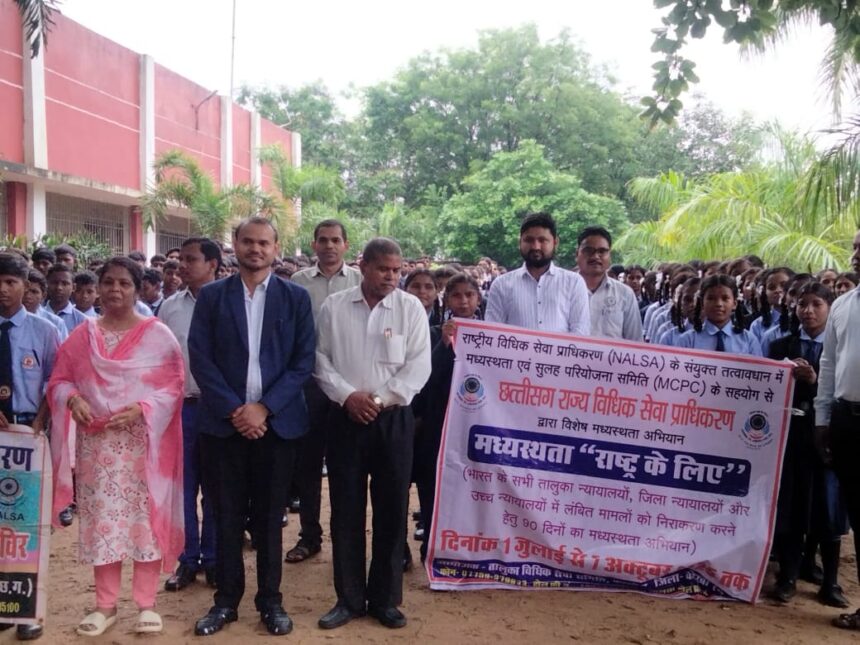 उनके द्वारा जानकारी देते हुए विद्यालय के विद्यार्थियों को बताया गया कि विधिक सेवा प्राधिकरण के द्वारा समाज के कमजोर वर्गों को मुफ्त कानूनी सेवाएं प्रदान की जाती है। मुख्य रूप से विद्यार्थियों को लैंगिक अपराधों से बच्चों का संरक्षण अधिनियम 2012 (पोस्को) एवं मोटर वाहन अधिनियम 1988 के बारे में विस्तृत जानकारिया दी गयी। राष्ट्रीय विधिक सेवा प्राधिकरण के संयुक्त तत्वाधान में मध्यस्थता एवं सुलह परियोजना समिति के सहयोग से छत्तीसगढ़ राज्य विधिक सेवा प्राधिकरण द्वारा 1 जुलाई से 7 अकटुबर तक चलाये जा रहे विशेष अभियान “मध्यस्था-राष्ट्र के लिए” की जानकारियां विद्यार्थियों को दी गयी।