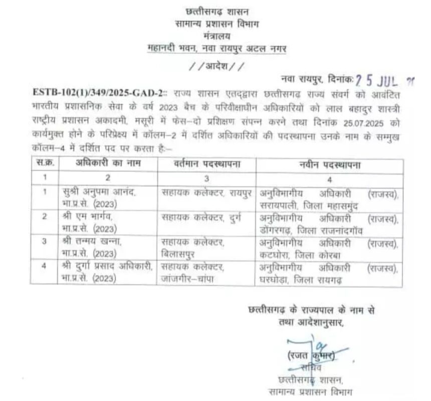 उक्त सूची में 2023 बैच के आईएएस अनुपमा आनंद को सहायक कलेक्टर रायपुर से अनुविभागीय अधिकारी सरायपाली महासमुंद भेजा गया हैं। आईएएस एम. भार्गव को सहायक कलेक्टर दुर्ग से अनुविभागीय अधिकारी डोंगरगढ़ राजनांदगांव भेजा गया हैं। आईएएस तन्मय खन्ना को सहायक कलेक्टर बिलासपुर से अनुविभागीय अधिकारी कटघोरा कोरबा, आईएएस दुर्गा प्रसाद अधिकारी को सहायक कलेक्टर जांजगीर-चांपा से अनुविभागीय अधिकारी घरघोड़ा रायगढ़ भेजा गया हैं।