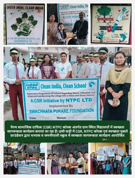 यह कार्यक्रम मंगलवार को CSR, एनटीपीसी कोरबा और स्वच्छता पुकारे फाउंडेशन के संयुक्त तत्वावधान में आयोजित किया गया, जिसका उद्देश्य छात्रों को स्वच्छता, व्यक्तिगत साफ-सफाई और पर्यावरण संरक्षण के महत्व के बारे में जागरूक करना था। इस जागरूकता को मजबूत करने के लिए विद्यालयों में स्वच्छता और पर्यावरण संरक्षण से जुड़ी वाल पेंटिंग भी की गई।