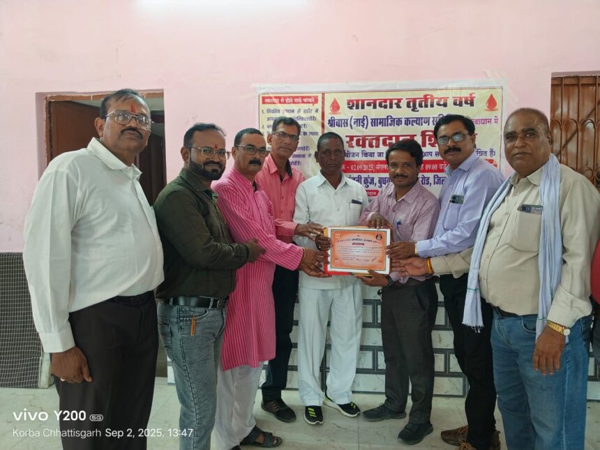 NOW HINDUSTAN. Korba. *कोरबा (02.09.2025) श्रीवास (नाई)कल्याण समिति कोरबा द्वारा समाज के नवयुवाओं में रक्तदान के लिए जागरूकता लाने और युवाओं को सकारात्मक दिशा देने के लिए रक्तदान शिविर का आयोजन किया गया था। रक्तदान शिविर का आयोजन अंजनी कुंज, श्रीवास सामुदायिक भवन कोरबा में सुबह 10 बजे से शायं 5 बजे तक संवेदना ब्लड बैंक कोरबा के द्वारा किया गया । जिसमें सभी रक्तताओं को प्रोत्साहन स्वरूप प्रमाण पत्र एवं सड़क सुरक्षा जागरूकता अभियान के तहत हेलमेट प्रदान वहा उपस्थित अतिथियों एवं सामाज के प्रमुख लोगों द्वारा किया गया।
