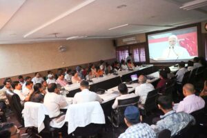 वंदे मातरम की 150 वीं वर्षगांठ पर आधारित कार्यक्रम का शुभारंभ आज देश की राष्ट्रीय राजधानी नई दिल्ली में प्रधानमंत्री नरेन्द्र मोदी के द्वारा किया गया, जिसका लाईव प्रसारण हुआ। नगर पालिक निगम कोरबा के मुख्य प्रशासनिक भवन साकेत में वंदे मातरम कार्यक्रम का आयोजन किया गया। महापौर श्रीमती संजूदेवी राजपूत, सभापति नूतन सिंह ठाकुर, मेयर इन काउंसिल सदस्य हितानंद अग्रवाल सहित निगम के एम.आई.सी.सदस्यों, पार्षदों, जनप्रतिनिधियों व अधिकारी कर्मचारियों ने लाईव प्रसारण कार्यक्रम में सम्मिलित होते हुए प्रधानमंत्री नरेन्द्र मोदी द्वारा दिए गए गरिमापूर्ण उद्बोधन का श्रवण किया। इस मौके पर निगम में आयोजित कार्यक्रम में उपस्थित समस्तजनों के द्वारा वंदे मातरम का सामूहिक गायन भी किया गया।