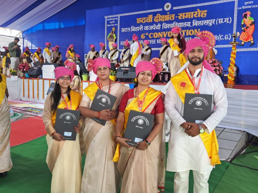 NOW HINDUSTAN. Korba. कोरबा। अटल बिहारी वाजपेयी विश्वविद्यालय बिलासपुर से जारी मेरिट लिस्ट में सत्र 2023-24 की मुख्य व सेमेस्टर परीक्षाओं में अपनी योग्यता का लोहा मनवाते हुए महाविद्यालय के 32 विद्यार्थियों ने मेरिट में जगह बनाई। बीते दिनों को बिलासपुर में आयोजित दीक्षांत समारोह में युनिवर्सिटी टाॅपर रहीं मास्टर ऑफ आर्ट्स (शिक्षा) से लता चंद्रा व मास्टर ऑफ लाइब्रेरी एंड इंफॉर्मेशन साइंस (एमलिब एंड आईएससी) में अपर्णा यादव को गोल्ड मेडल प्रदान कर सम्मानित किया गया।
