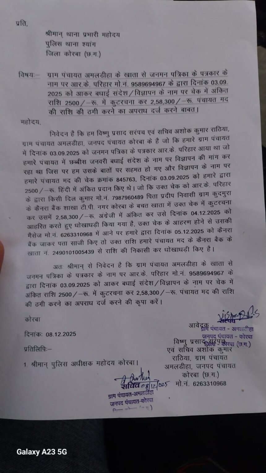 NOW HINDUSTAN. Korba. ग्राम पंचायत अमलडीहा में पंचायत मद की राशि से बड़ी धोखाधड़ी का मामला सामने आया है। सरपंच विष्णु प्रसाद और सचिव अशोक कुमार राठिया ने थाना श्यांग में शिकायत दर्ज कराई है कि स्वयं को जनमन पत्रिका का पत्रकार बताने वाला आर.के. परिहार दिनांक 03 सितंबर 2025 को पंचायत आया था। उसने 26 जनवरी बधाई संदेश के नाम पर विज्ञापन देने की मांग की, जिस पर पंचायत की ओर से 2500 रुपये का चेक क्रमांक 845763 जारी किया गया था। चेक में राशि हिंदी में अंकित थी। आरोप है कि आर.के. परिहार ने चेक में कुटरचना करते हुए 2500 रुपये की जगह 2,58,300 रुपये अंग्रेजी में अंकित कर दिया और अगले ही दिन 04 दिसंबर 2025 को यह राशि दिल कुमार निवासी कुदमुरा के कैनरा बैंक, टीपी नगर शाखा के खाते में जमा कर आहरित कर ली।