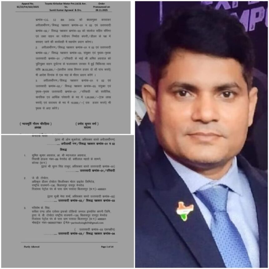 NOW HINDUSTAN. Korba. छत्तीसगढ़ राज्य उपभोक्ता आयोग ने एक महत्वपूर्ण फैसले में सीतामढ़ी कोरबा निवासी सुमित अग्रवाल को कुल 61 लाख 36 हजार रुपए देने का आदेश टोयटा कंपनी को दिया है, क्योंकि कंपनी की इनोवा कार में दुर्घटना के समय उसका कोई भी एअर बैग नहीं खुला था।