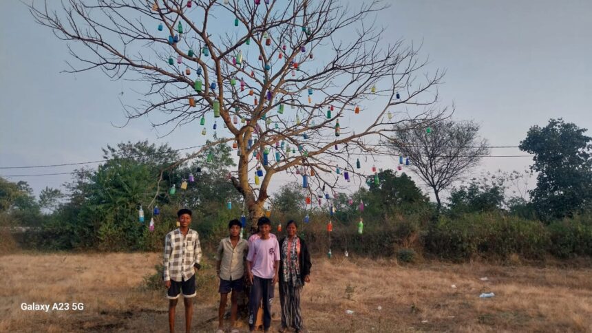 NOW HINDUSTAN. Korba. ग्राम पंचायत पकरिया के नवापारा गांवों के एक मैदान में स्थित एक सूखा पेड़ इन दिनों स्थानीय लोगों के आकर्षण का केंद्र बना हुआ है। देखने में सामान्य और वर्षों से सूख चुका यह पेड़ अब रंगीन बोतलों की सजावट से झिलमिला उठता है। यह अनोखी सजावट गांव के बच्चों के द्वारा की गई, जिन्होंने बेकार पड़ी कांच की बोतलों को इकट्ठा कर उन्हें कला और जागरूकता का माध्यम बनाया। स्थानीय ग्रामीणों के अनुसार, कुछ महीने पहले तक यह पेड़ पूरी तरह बेजान और कुरूप नजर आता था।