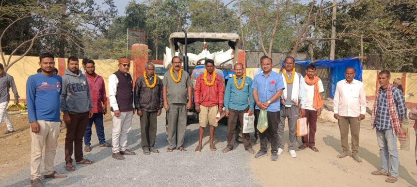 NOW HINDUSTAN. Korba. किसान दिवस के अवसर पर धान खरीदी केंद्र बक्सरा शाखा बलौदा जिला जांजगीर चांपा में धान लेकर आए किसानों का धान खरीदी केंद्र प्रभारी एवं समिति अध्यक्ष भागीरथी देवांगन द्वारा पुष्पहार से स्वागत किया गया, सबसे पहले आए किसान की ट्रेक्टर को खरीदी प्रभारी धन्नू अहीर द्वारा चला कर स्वागत के साथ खरीदी केंद्र लाया गया,