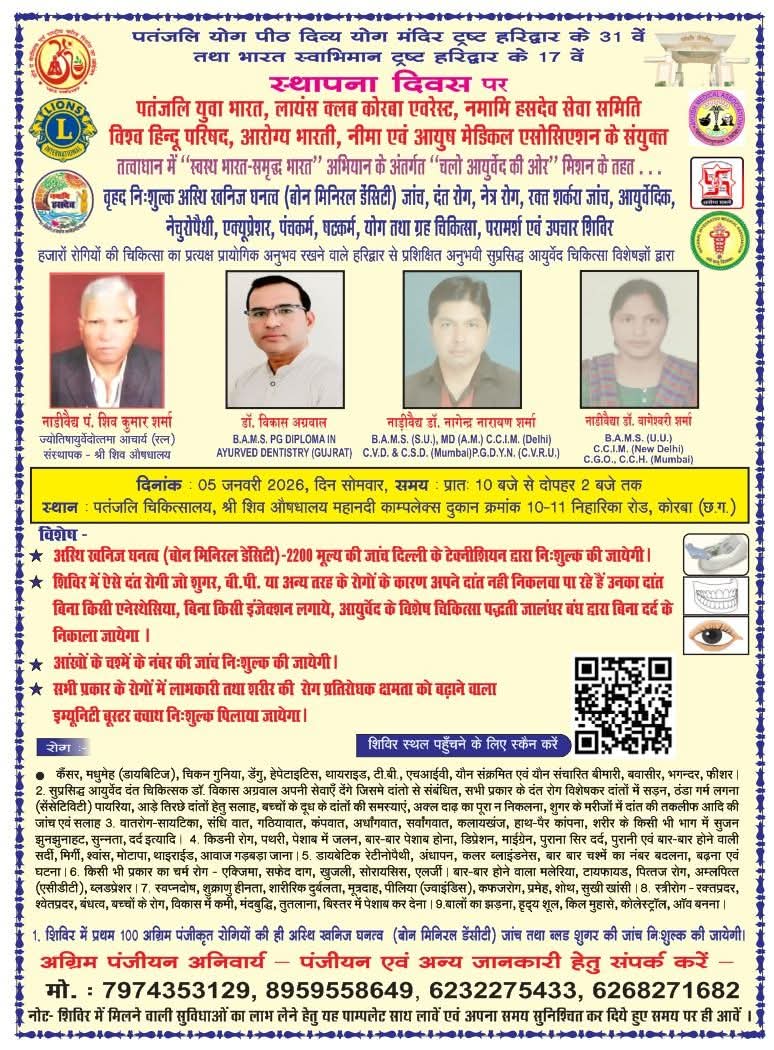 NOW HINDUSTAN. Korba. 5 जनवरी पतंजलि योगपीठ दिव्य योग मंदिर ट्रस्ट के 31 वें एवं भारत स्वाभिमान के 17 वें स्थापना दिवस पर निशुल्क दंत रोग,अस्थि खनिज घनत्व (बोन मिनरल डेंसिटी) जांच, नेत्र जांच, रक्त शर्करा जांच तथा स्त्री, पुरुष एवं बच्चों के सभी सामान्य, साध्य, कष्टसाध्य, एवं असाध्य रोगों हेतु निशुल्क आयुर्वेद-योग चिकित्सा परामर्श एवं उपचार शिविर दिनाँक 05 जनवरी 2026 सोमवार को पतंजलि युवा भारत, लायंस क्लब कोरबा एवरेस्ट, नमामि हसदेव सेवा समिति, विश्व हिंदू परिषद, आरोग्य भारती, नीमा एवं आयुष मेडिकल एसोसिएशन के संयुक्त तत्वाधान में पतंजलि चिकित्सालय, श्री शिव औषधालय दुकान क्रमांक 10-11 महानदी काम्प्लेक्स, निहारिका कोरबा में प्रातः 10 बजे से मध्यान्ह 2 बजे तक आयोजित किया गया है।